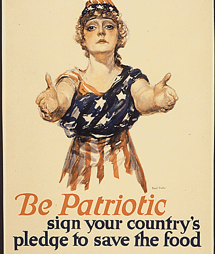The posters above were published by the U.S. Food Administration, created by Woodrow Wilson by executive order in 1917. Leading the newly-formed administration, Herbert Hoover had the power to act as “food dictator,” but strove to design “an effort that would appeal to the American sense of volunteerism and avoid coercion.” (I know I’m getting a little off track here, but I think this is interesting stuff and definitely relevant to the question of how to get large groups of people to act quickly in helpful ways for a common cause–like climate change.)