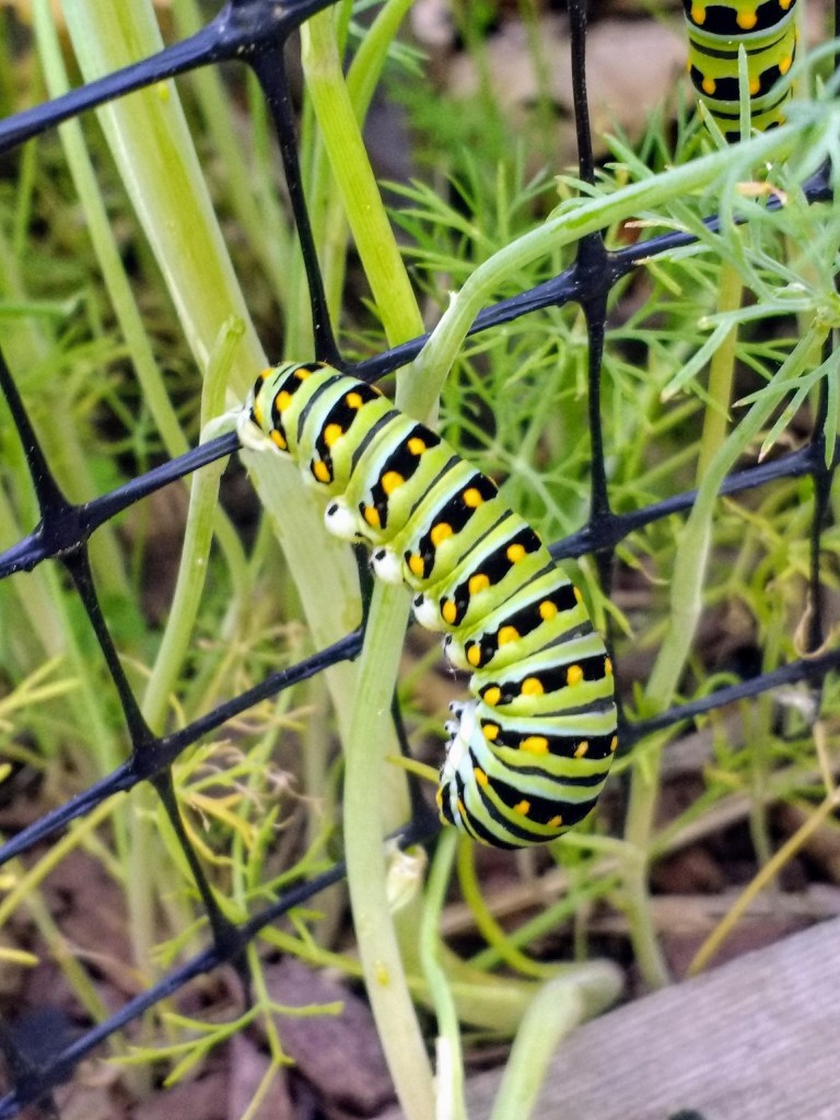 - One year my parsley was disappearing at an alarming rate. The culprit was this beautiful swallowtail caterpillar, which shown here, is feasting on dill. (Both parsley and dill, by the way, are non-native plants, but the swallowtail will eat them because they are close enough relatives of native members of the carrot family.) Plant a little extra and be happy they found a home in your garden.